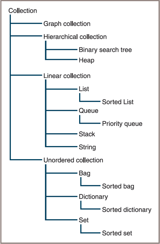 linear, hierarchical, graph, and unorderedstring, list, tuple, set, and dictionary
