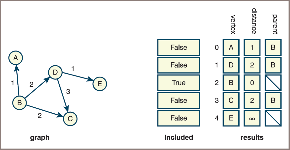 • A graph and the initial state of the data structures used to compute the shortest paths from a given vertex