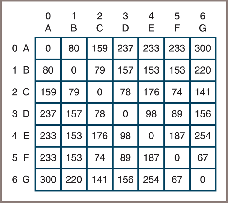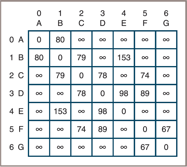 • Using the figure above, you will build an initial distance matrix whose cells contain the weights on the edges that connect each vertex with its neighbors