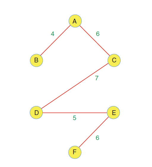 • The minimum spanning tree consists of the edges AB, AC, CD, DE, and EF, for a total edge weight of 28