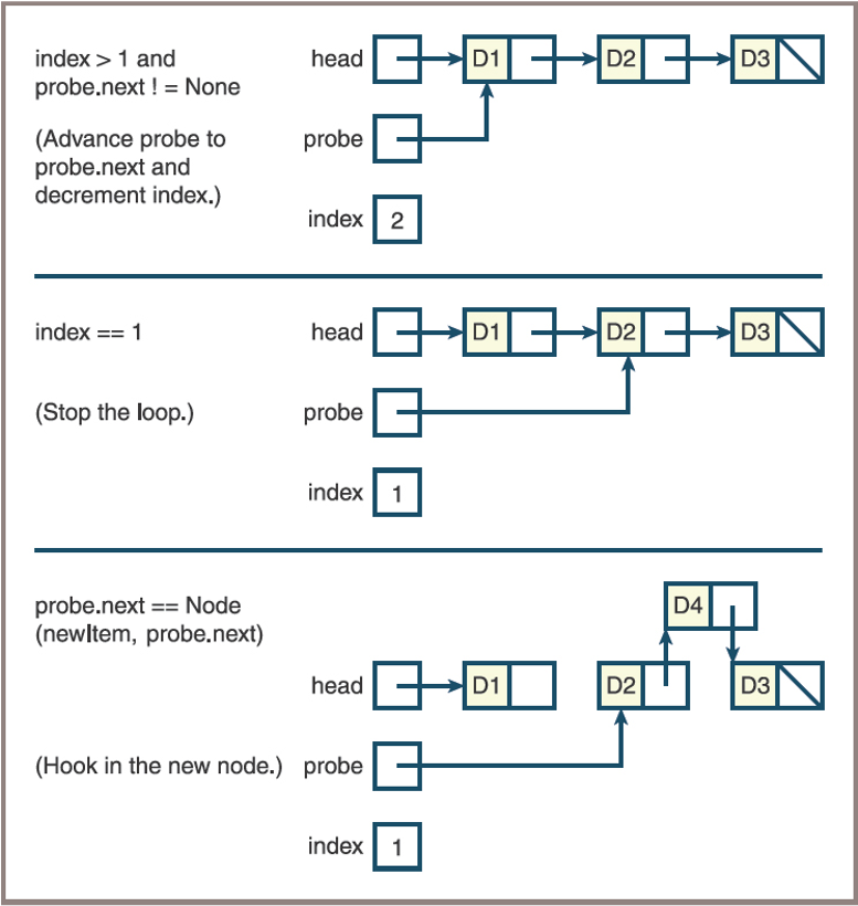 probe.next = Node(newItem, probe.next)# Assumes that the linked structure has at least one item