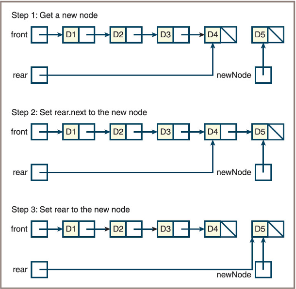 push adds a node at the head of the sequenceadd adds a node at the tailrear of the LinkedQueue class are given an initial value of Nonesize , already defined in the collection framework, tracks the number of elements currently in the queueadd operation,