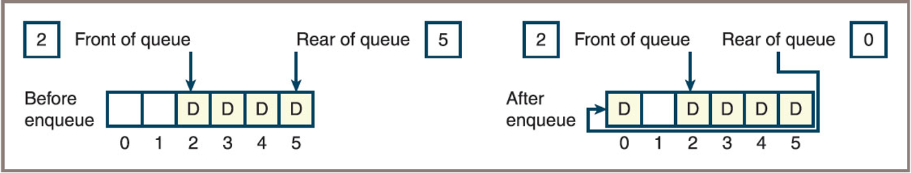 The implementation resembles the previous one in one respect: the front and rear pointers both start at the beginning of the array