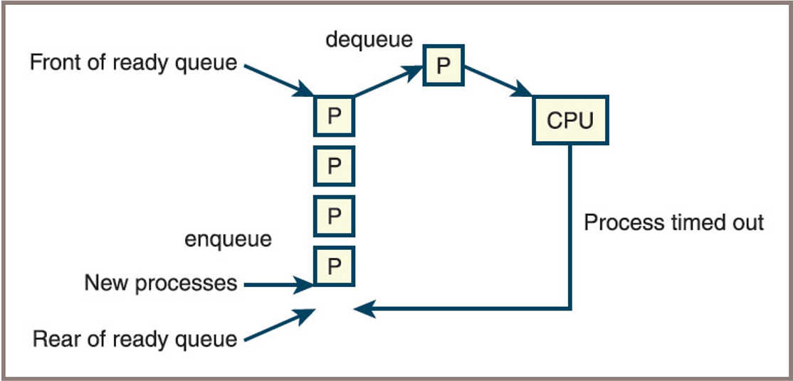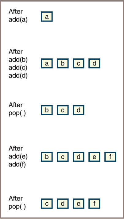 | q.pop() | b c | a | Remove the front item from the queue and return it. b is now the front item. |