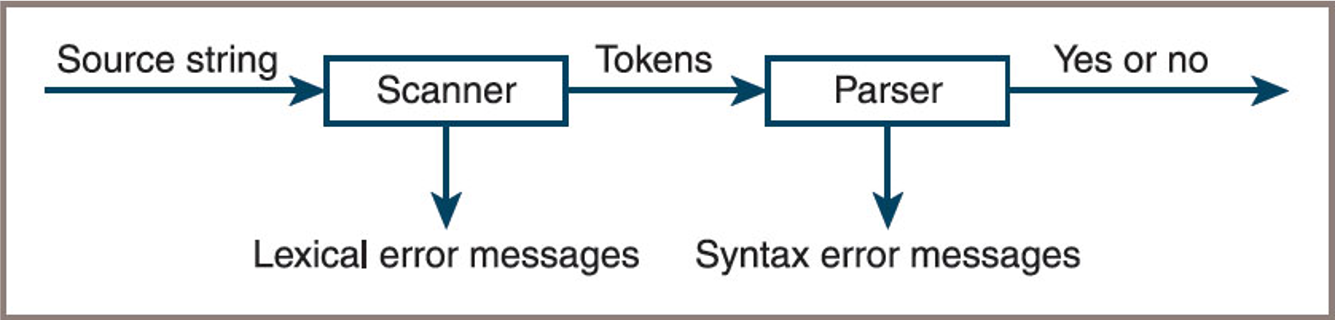 Recognizer – analyzes a string to determine if it is a sentence in a given languageParser – has all the features of a recognizer and returns information about the syntactic and semantic structure of a sentenceInterpreter – carries out the actions specified by a sentencescannerlexical analysis