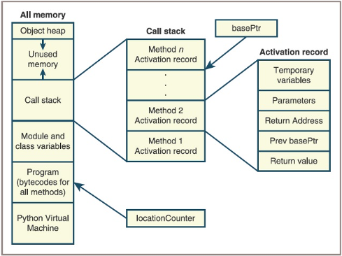 Python Virtual Machine (PVM) then executes thesebasePtr’s current value in the region labeled Prev basePtr and sets the basePtr to the new activation record’s baselocationCounter’s current value in the region labeled Return Address and sets the locationCounter to the first instruction of the called subroutineParameterslocationCounterlocationCounter and the basePtr from values stored in the activation recordlocationCounterArrayStack and LinkedStacktester program that shows how you can test them immediately